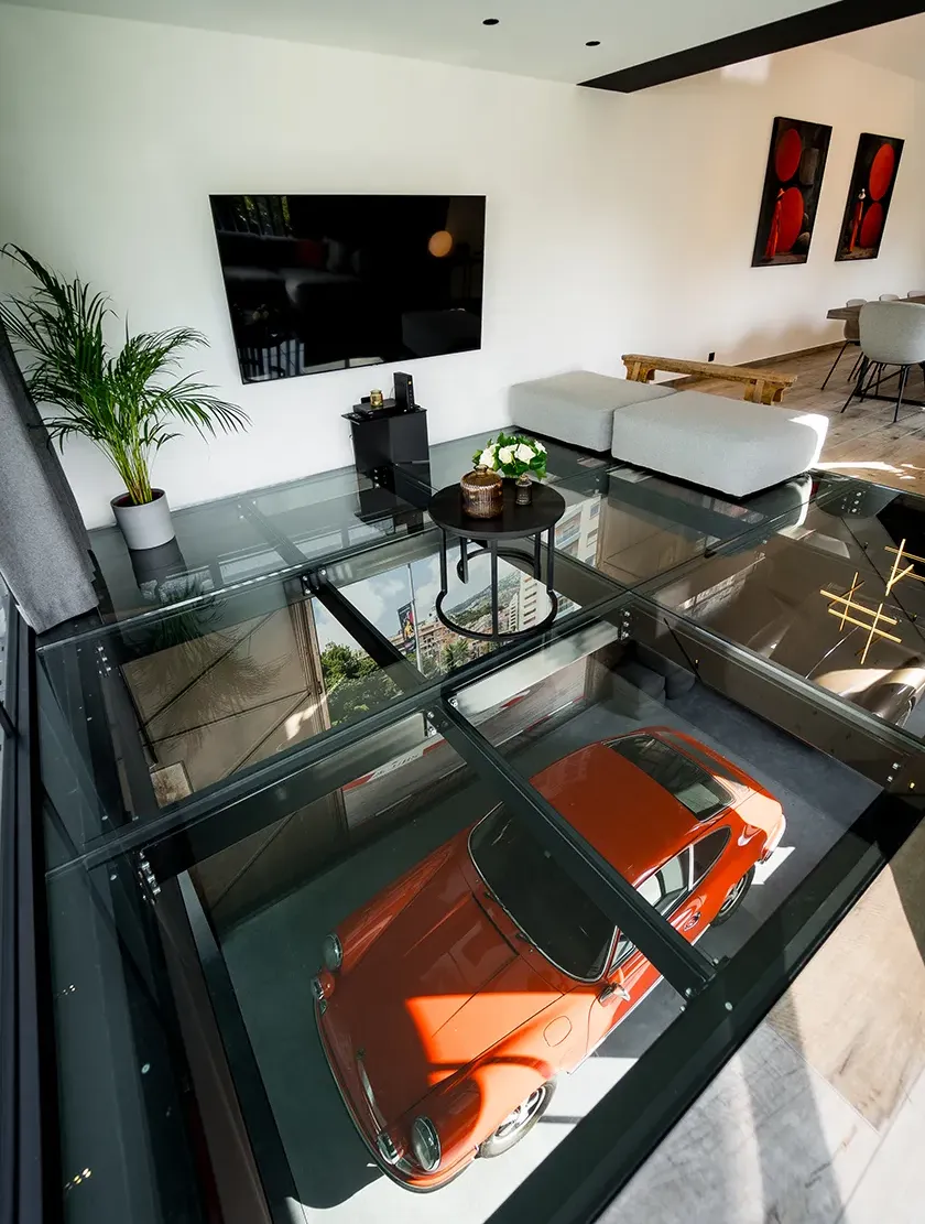 Sous vos yeux et à vos pieds, le sol vitré des espaces de vie révèle des voitures de collection soigneusement mises en scène.